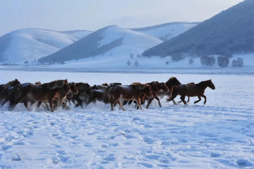 倒计时4秒,成群的骏马驰骋在茫茫雪原。