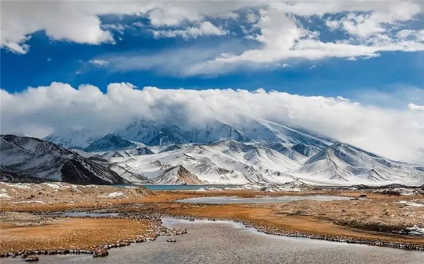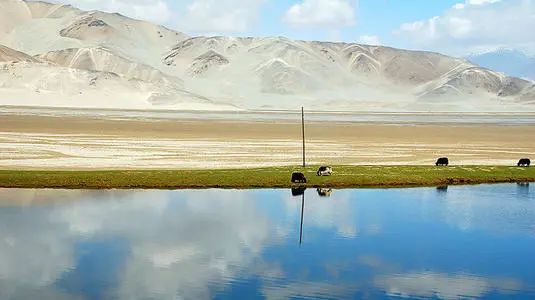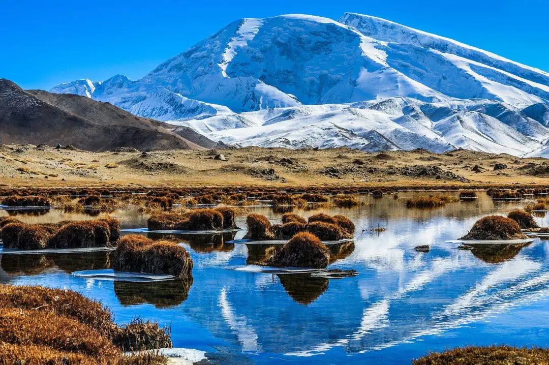 水面映衬着巍峨又神秘的慕士塔格峰,白雪皑皑,山水同色,景色十分迷人。