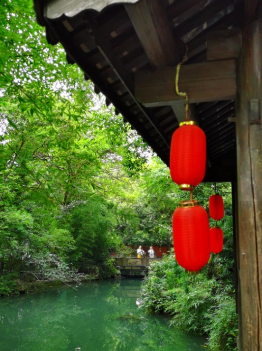 而锦里则不一样,这里除了宽窄巷子刚才所提到的各种特质之外,还有一些别样的风情,不同风格的建筑,漂亮的灯笼,成排的垂柳,清澈的溪流,还有那一湖碧水,水上的拱桥和长廊,这一切,更像是走进了江南风情。