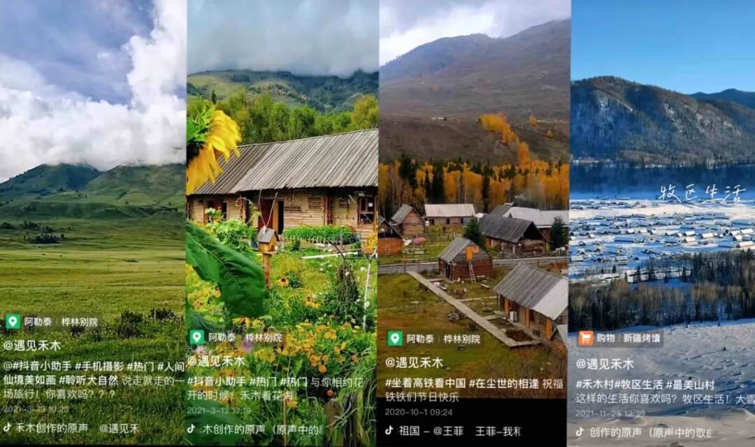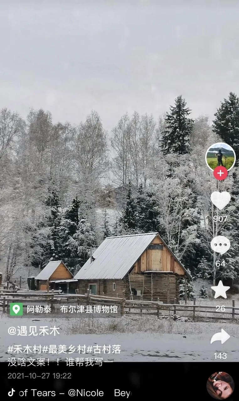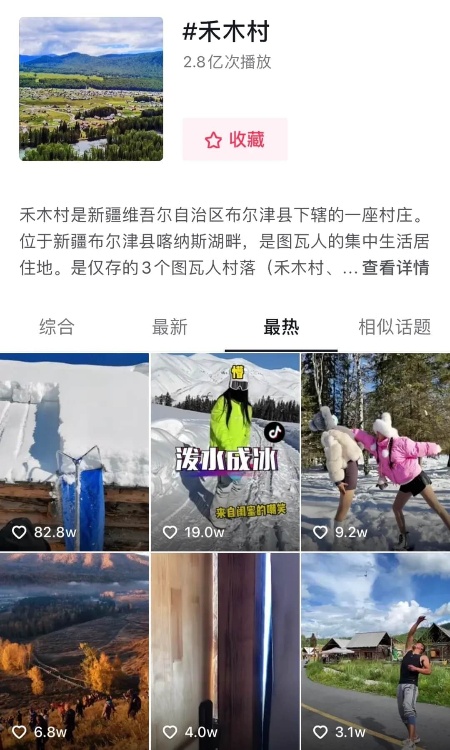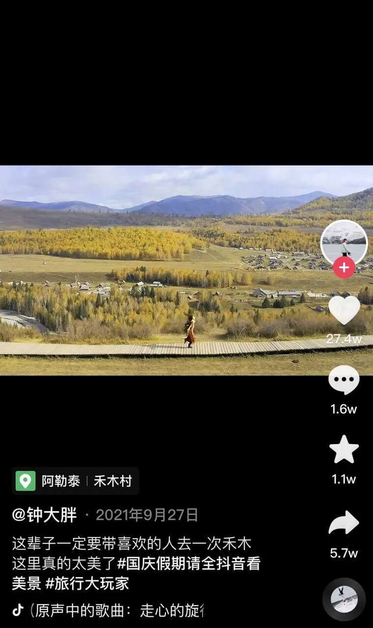 事实上,村里爱刷抖音的人不少,但少有人专门去拍村里的风景。那些让禾木村频频出圈的视频,大多出自来这里旅游的游客。相比卡了木江,这些专业的抖音旅游创作者显然更懂得怎样运用镜头语言。航拍远景、细节特写,再加上自己的真实感受,很快就让禾木村受到关注。仅在抖音上,播放过百万的打卡视频就有不少,“禾木村”这一话题的播放量更是超过2.8亿次。