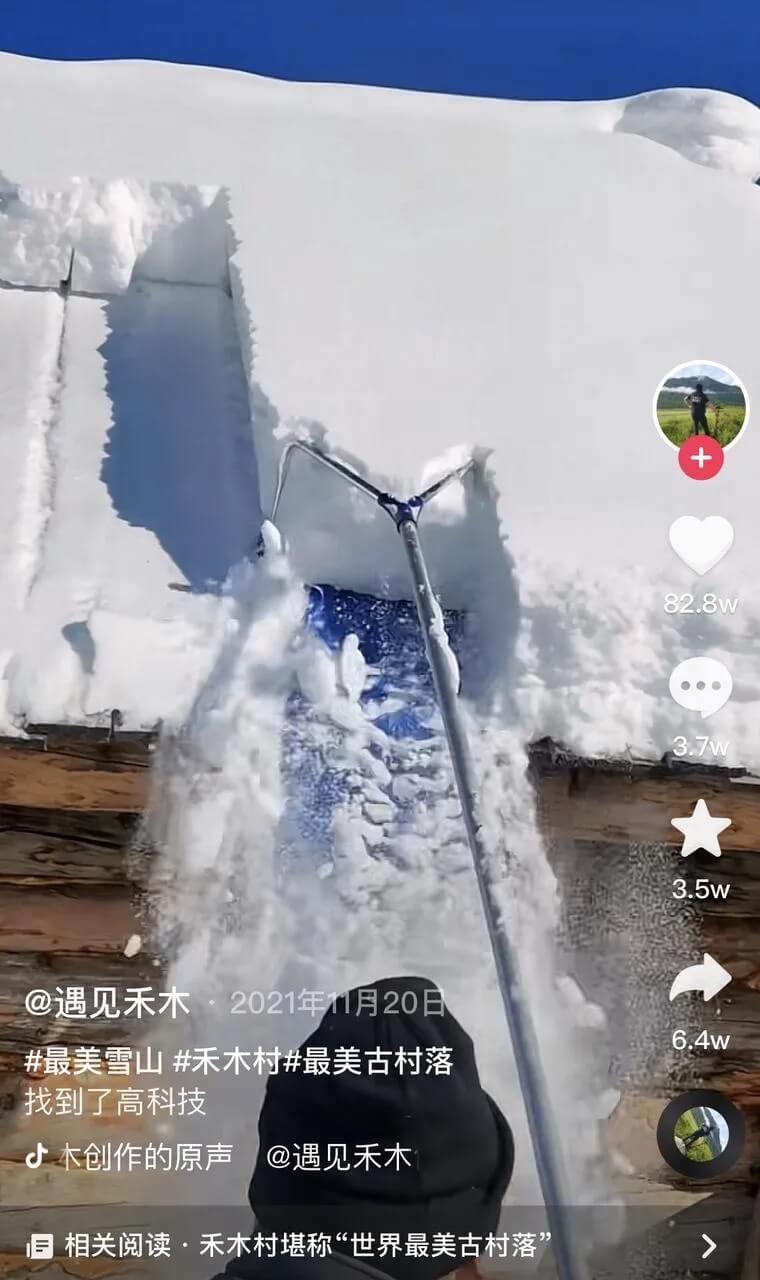 去年11月下旬,卡了木江在抖音上传了清理屋顶积雪的过程。让他没有想到的是,这一村里最常见的景象,居然上了抖音的热门推荐。短短11秒的视频最终获得82.8万点赞,3.7万条评论。